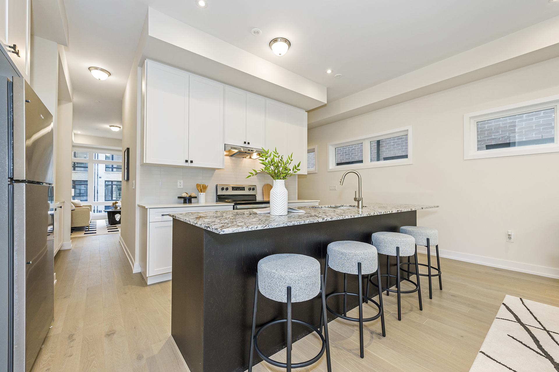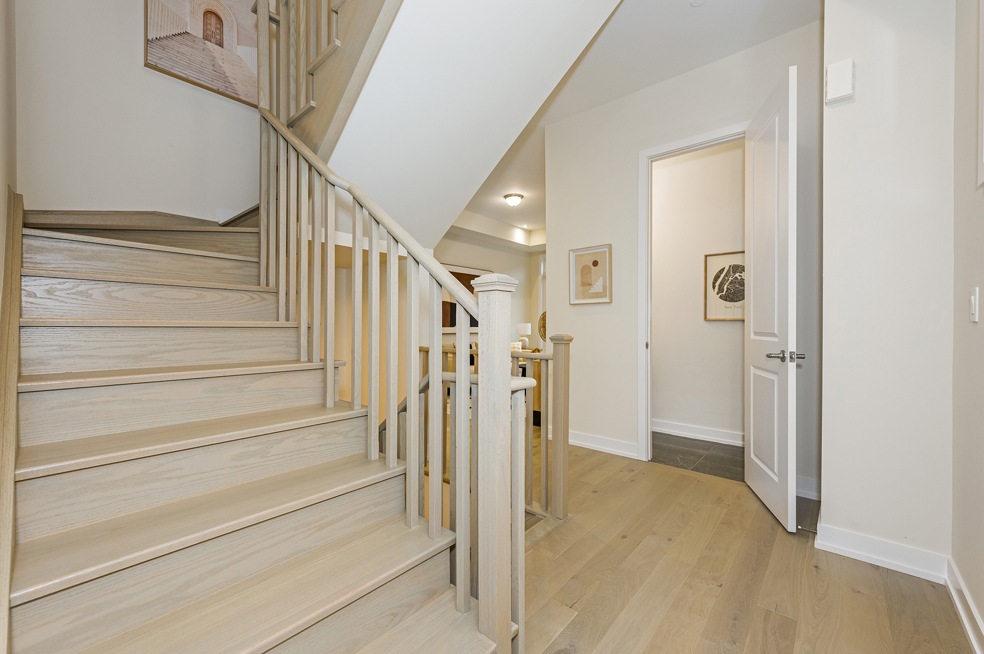Ravine lot—this is a must-see! Enjoy a rooftop terrace with a BBQ rough-in, a pot-lit kitchen and breakfast area, and A/C included for year-round comfort. The upgraded kitchen stands out with two-tone cabinetry, a stone countertop, an undermount sink, upgraded hardware, and a stylish backsplash. A stained oak staircase adds elegance throughout.